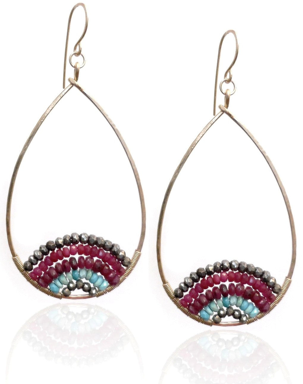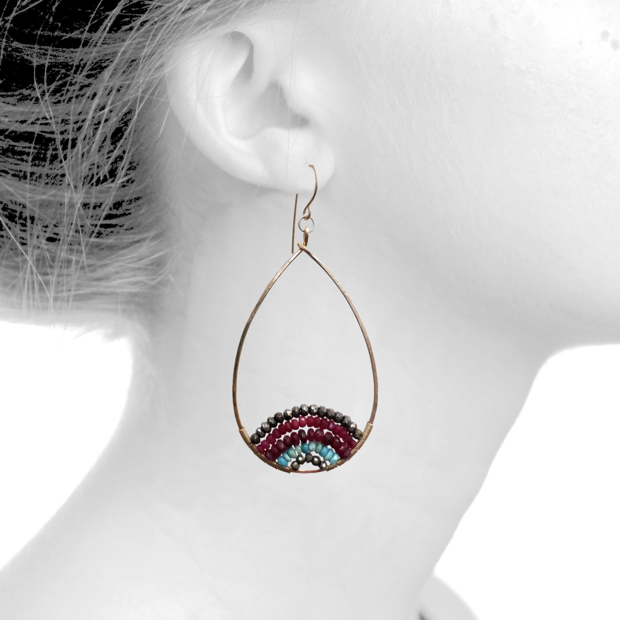 E0583 Hammered Gold Filled Teardrop with Pyrite, Rubies and Turquoise