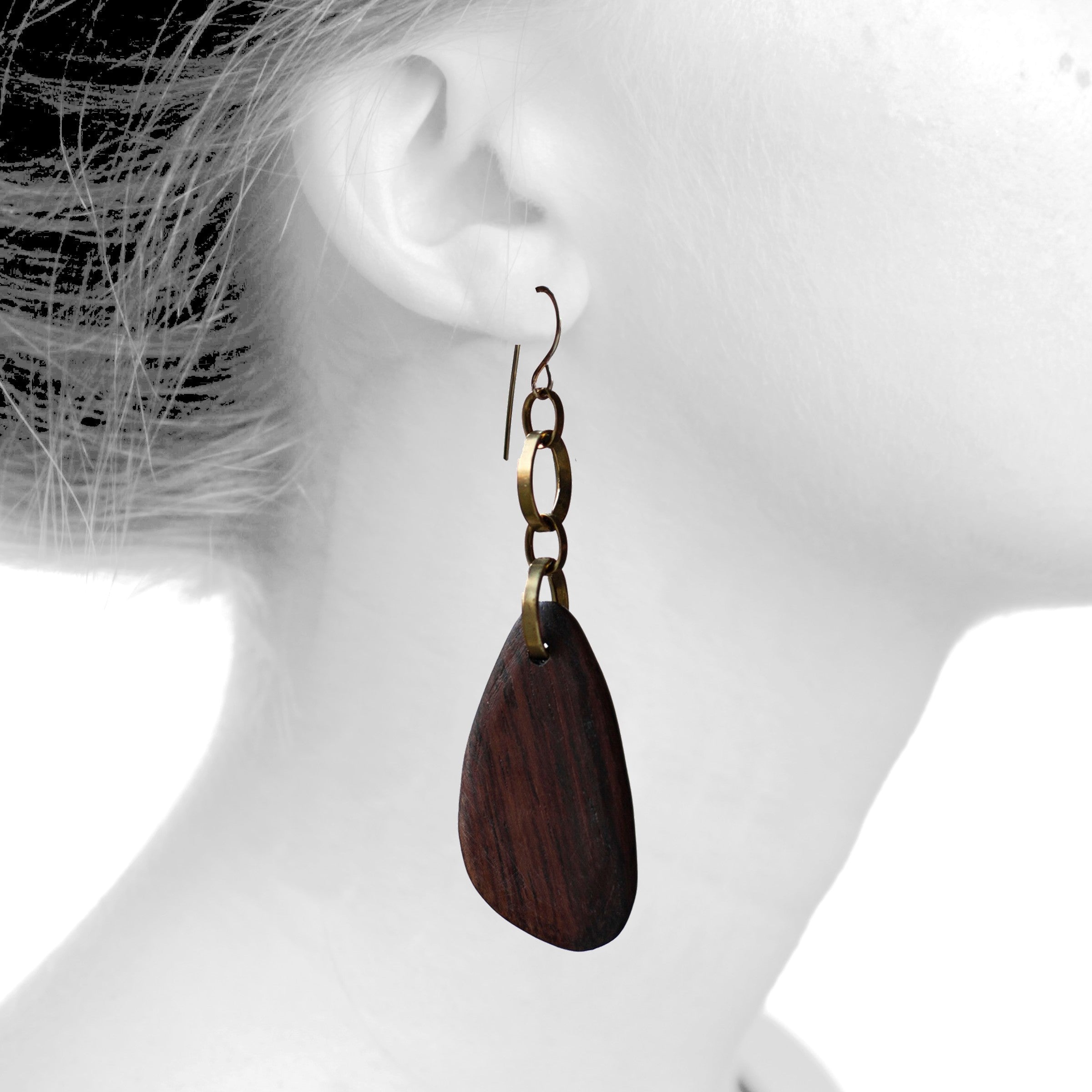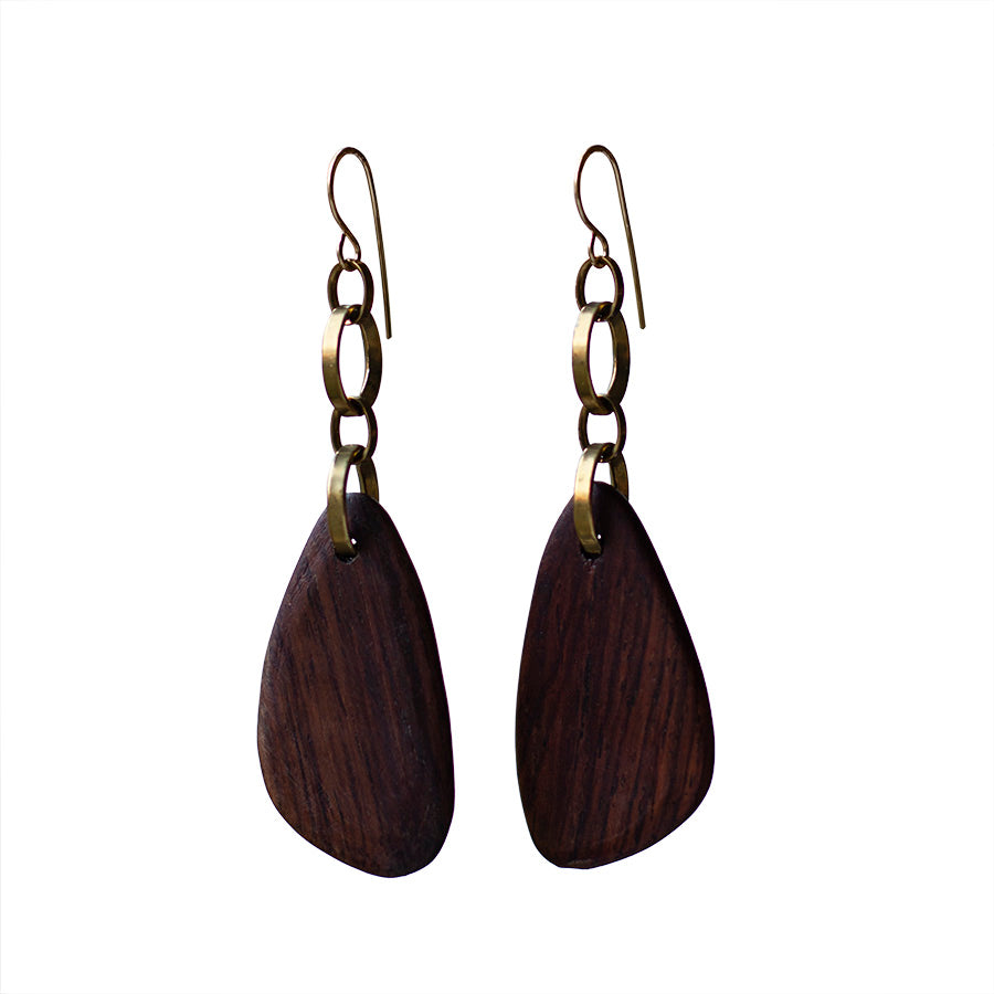 E0620 Carved Asymmetrical Wood Teardrops on Brass Chain with Gold Filled Ear Wires. 3 7/8" Long