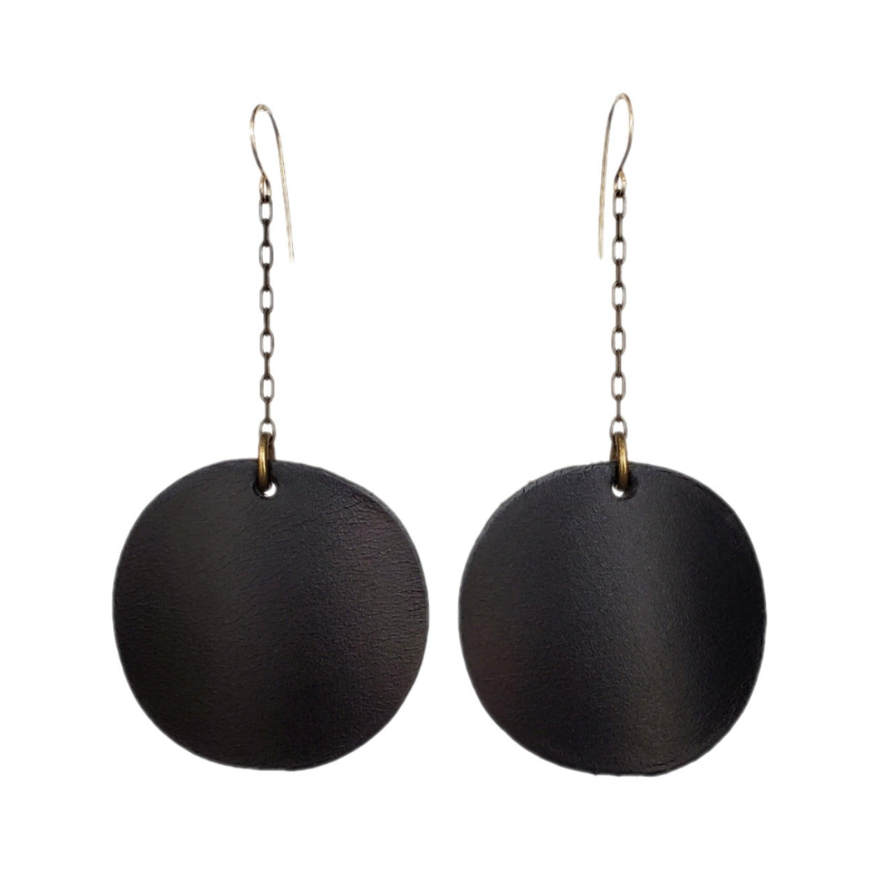 Black leather circle earrings on brass chain w/ gold filled ear wires 3.75" long
