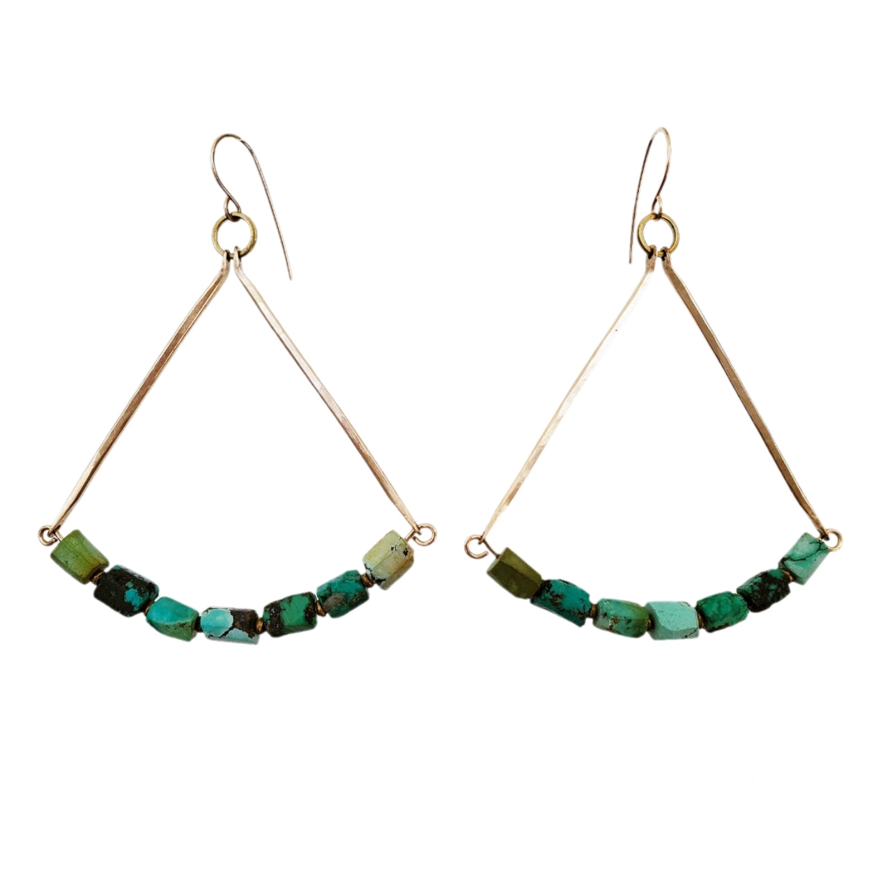 Turquoise, brass bead and hammered gold filled metal earrings 3.5"L X 2.75"W
