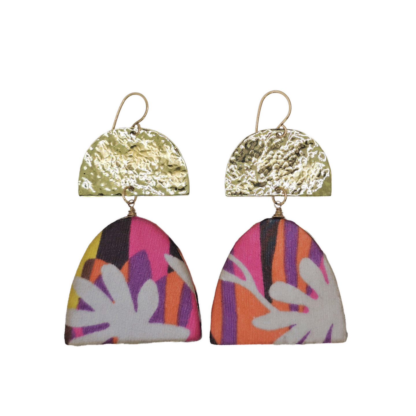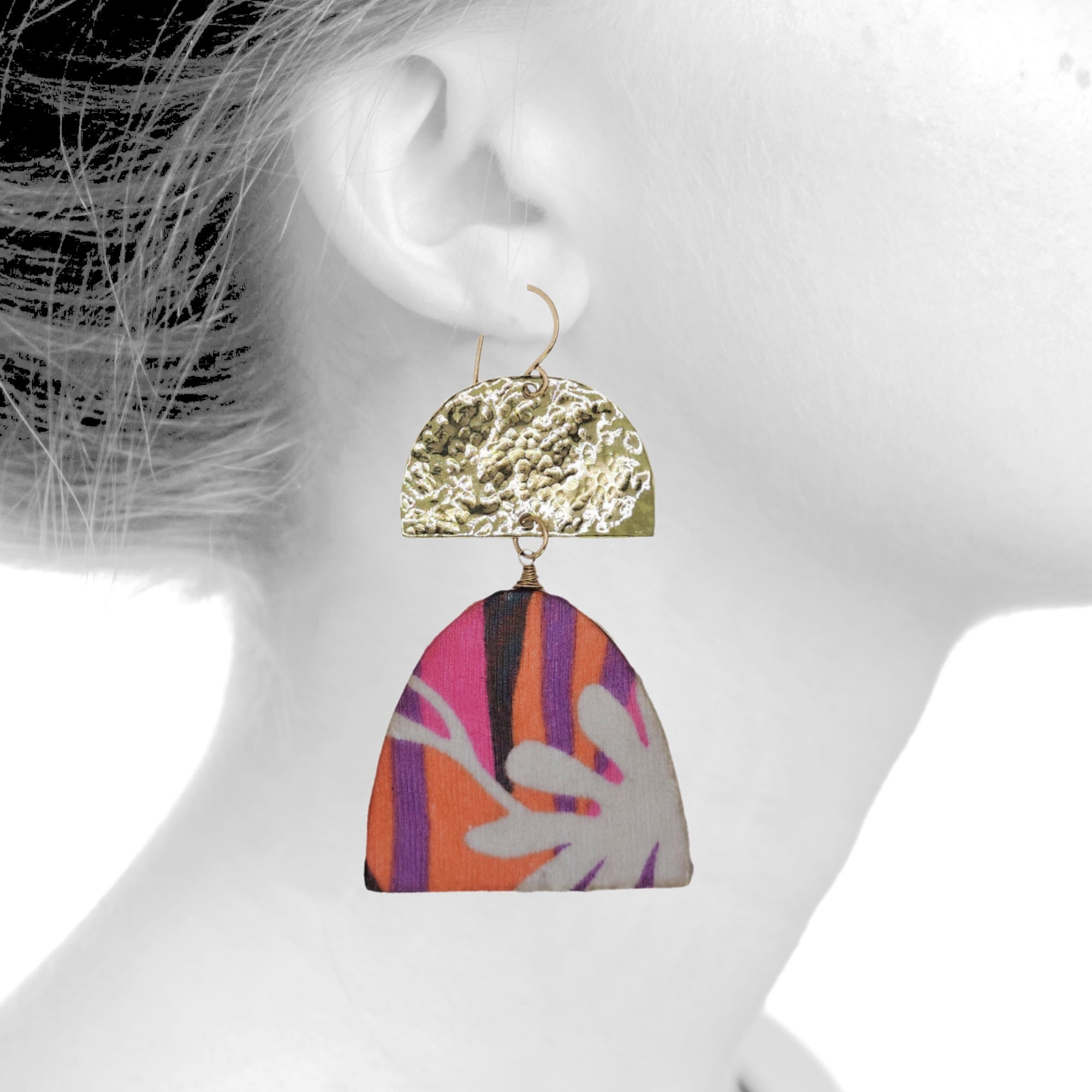 Repurposed Silk Fabric and Hammered Brass with Gold Filled Ear Wires
