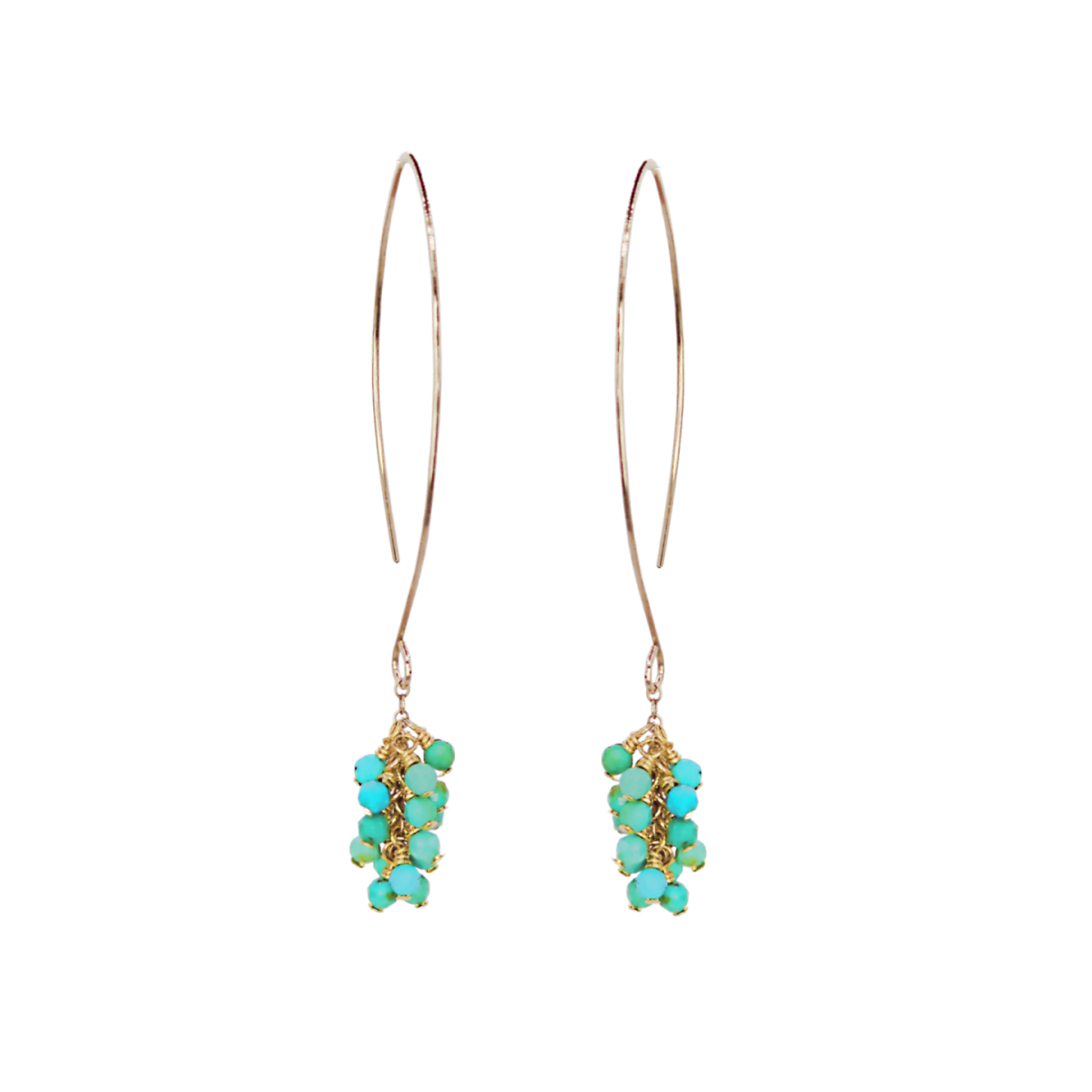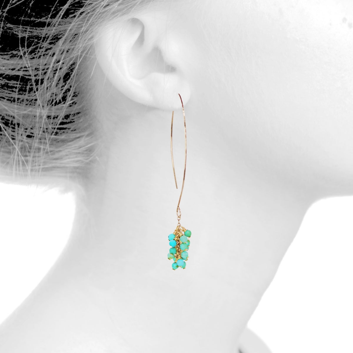 Tiny Turquoise Bead Clusters on Gold Filled Hammered Gold Ear Wire 3" Long