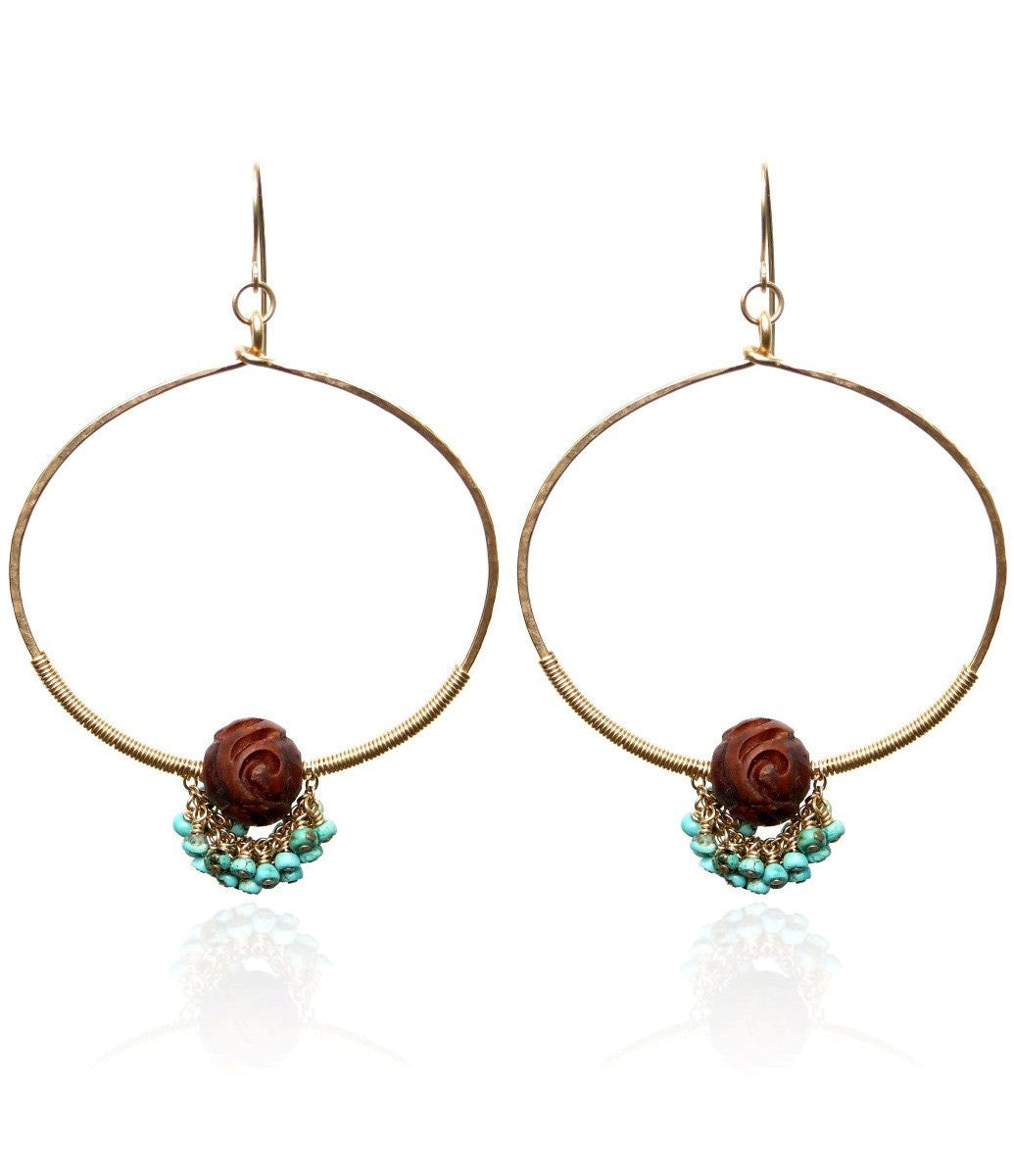 Carved Wood Bead Surrounded by Tiny Turquoise Bead Cluster on Hammered Gold Filled Wide Oval Earrings
