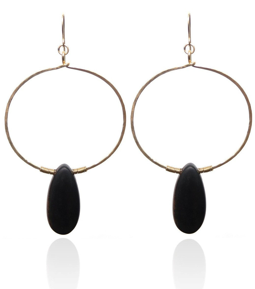 Wood Teardrop Bead on Gold Filled Hammered Wide Oval Earring