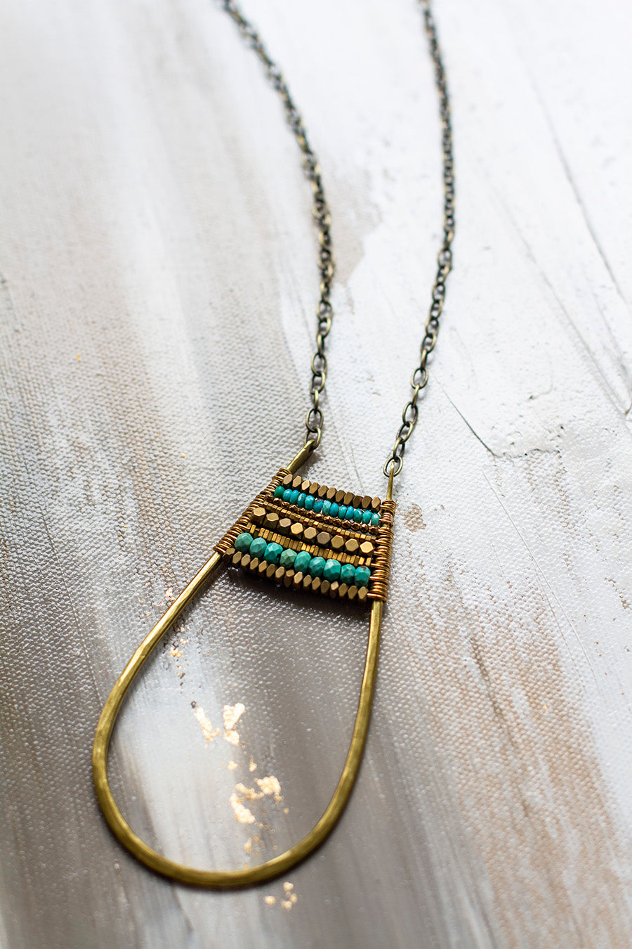 2222 Rows of Amazonite & Gold Hematite on Hammered Brass U Pendant on Adjustable Brass Chain.