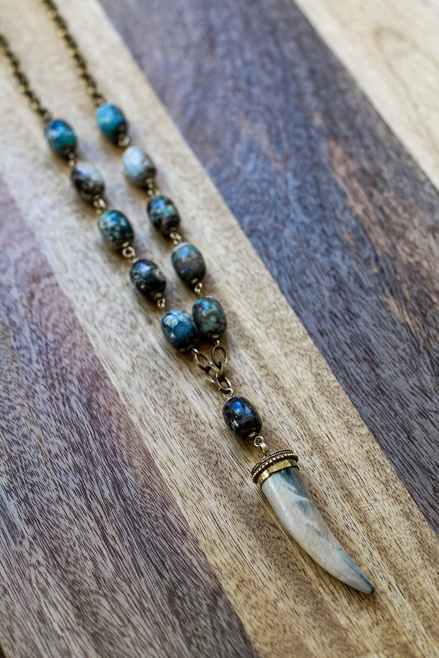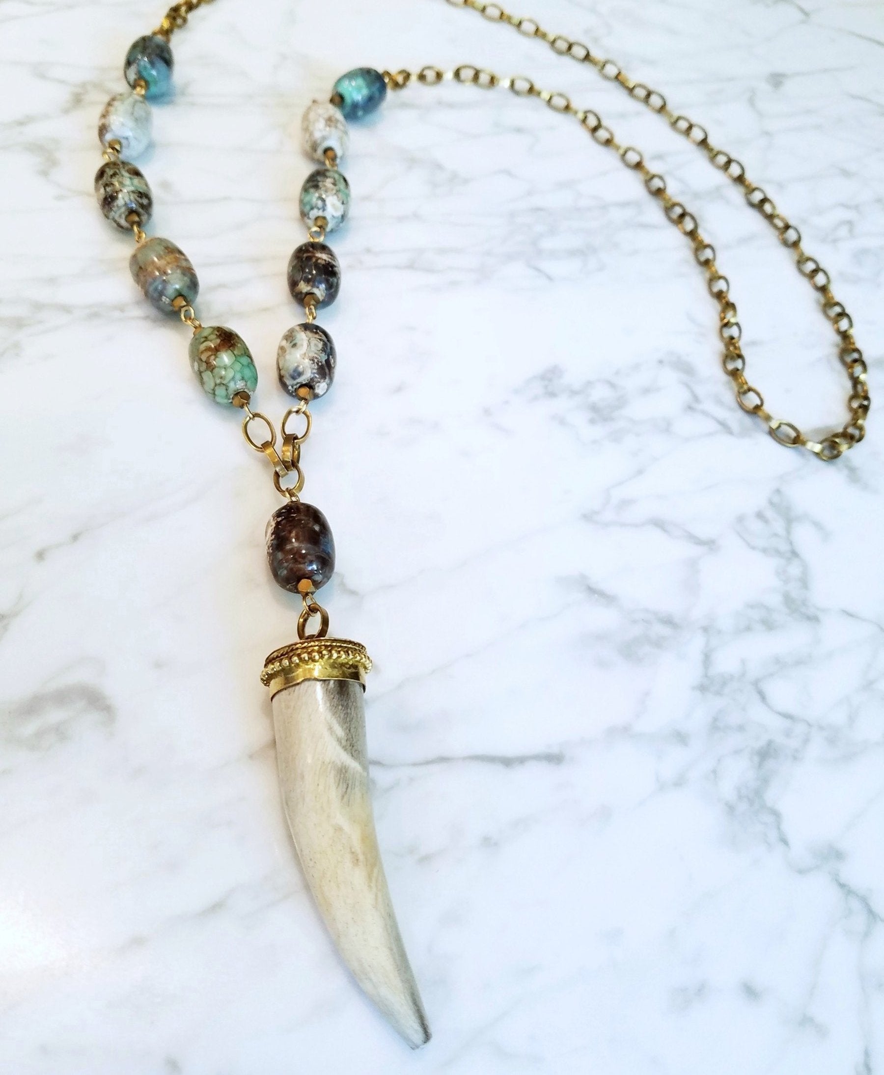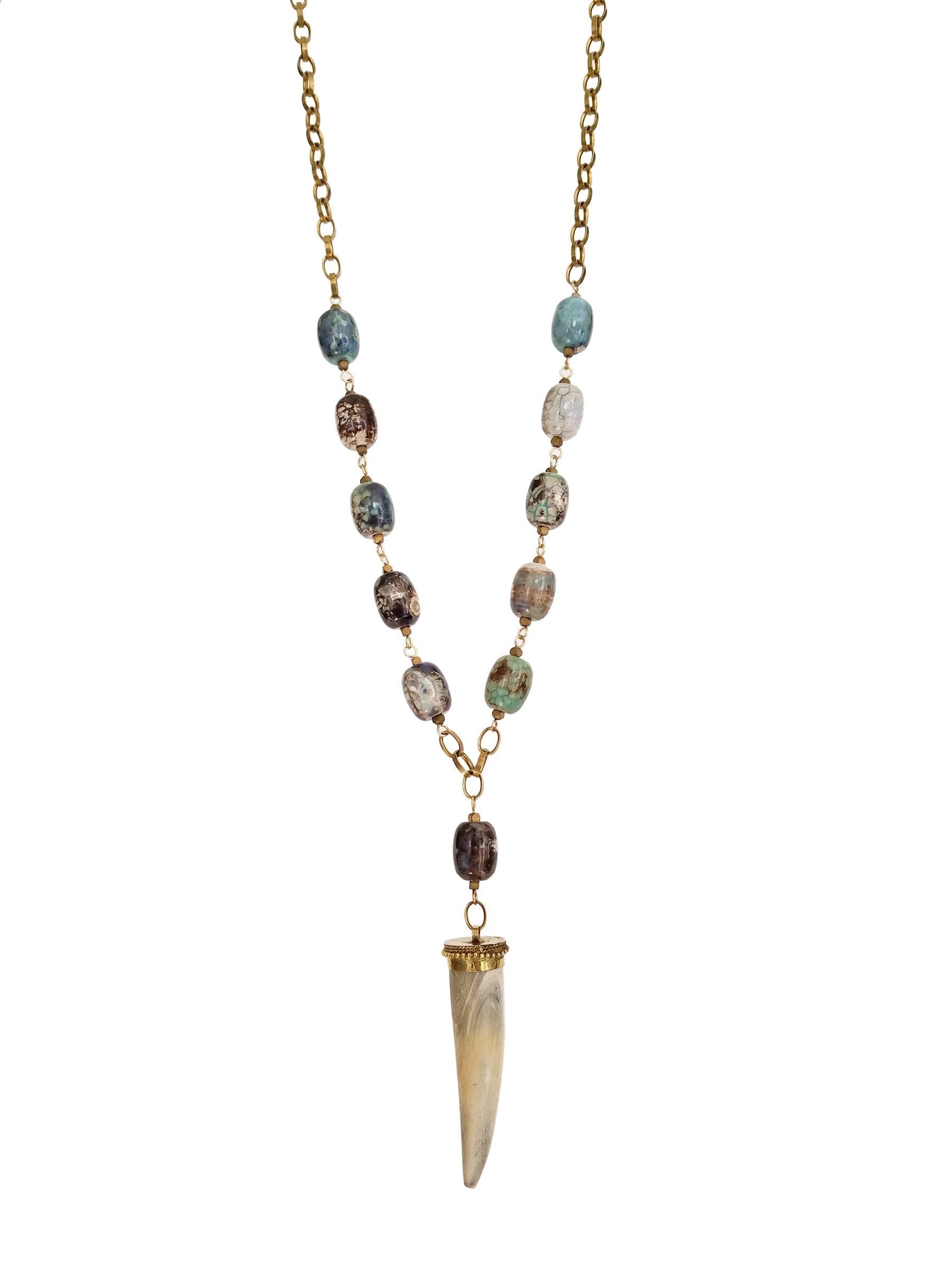 2227 Cream with Brass Horn Pendant on Shades of Blue, Brown & Cream Opal Agate Beads and Brass Chain